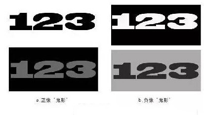 按照印品圖文的正負像,“鬼影”又可分為正像“鬼影”和負像“鬼影”。印品本身圖案顏色較深的部分稱為正像,在其圓周方向的外延形成相比正像顏色較淺的“影子”,即所謂的正像“鬼影”,如圖1a所示;印品本身圖案顏色較淺的部分稱為負像,在其圓周方向的外延形成的相比負像顏色較深的“影子”,即所謂的負像“鬼影”,如圖1b所示。